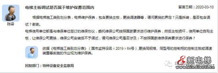 回復(fù)】依據(jù)《電梯施工類別劃分表》(國市監(jiān)特設(shè)函﹝2019﹞64號),更換同規(guī)格、同型號的控制柜的控制主板或調(diào)速裝置等實施的作業(yè)視為維護保養(yǎng)。