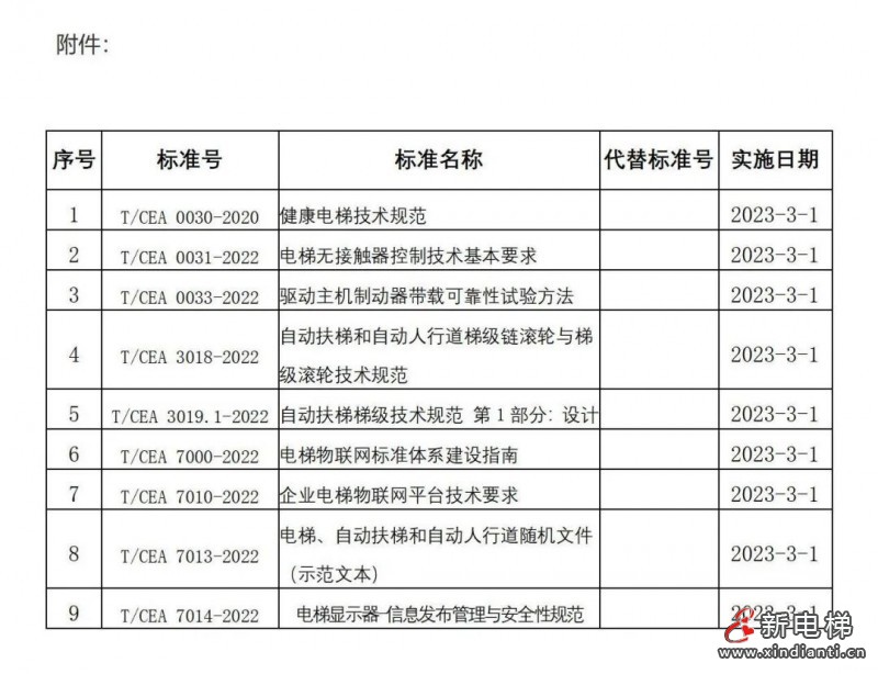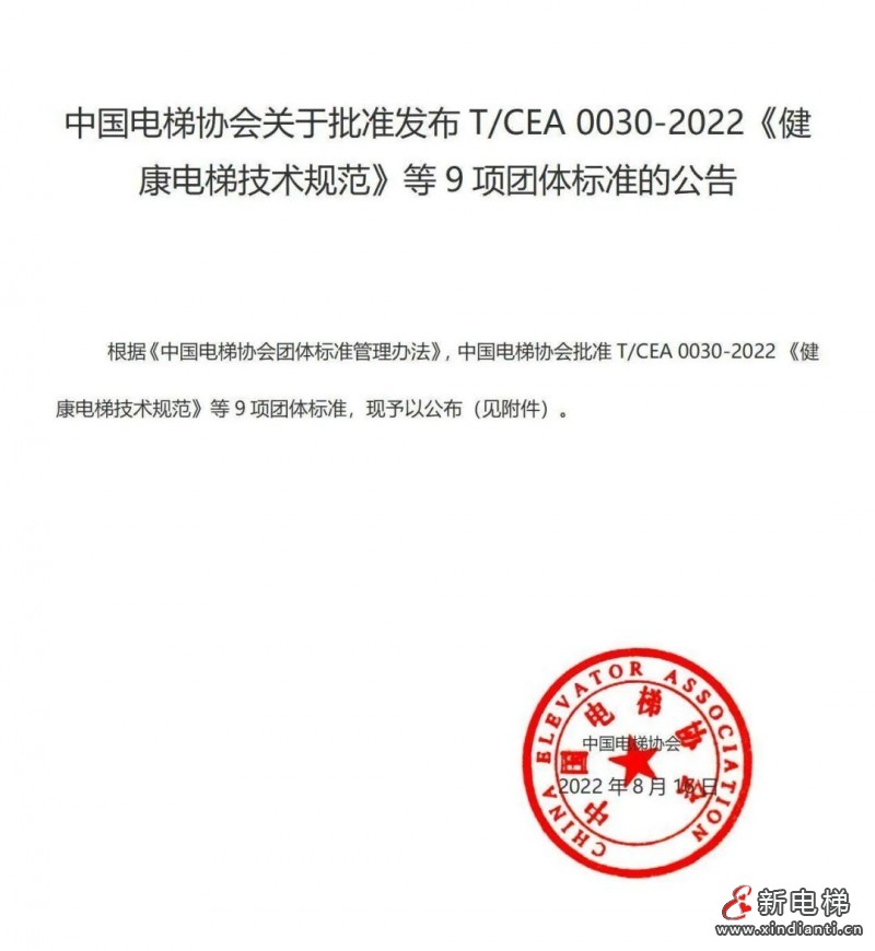 中國(guó)電梯協(xié)會(huì)關(guān)于批準(zhǔn)發(fā)布T/CEA 0030-2022《健康電梯技術(shù)規(guī)范》等9項(xiàng)團(tuán)體標(biāo)準(zhǔn)的公告